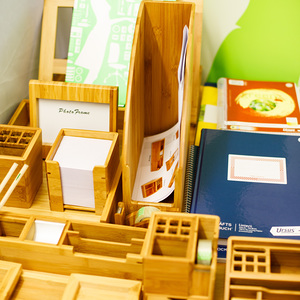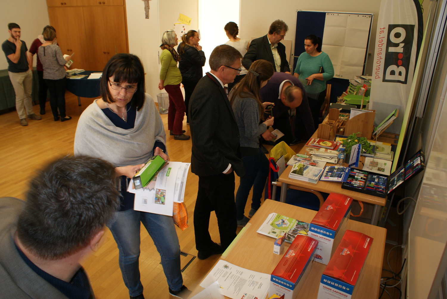 Zerlegbare Mappen, Recycling-Hefte, lösungsmittelfreie Klebstoffe, Ablagen aus Bambus, Kugelschreiber aus PET-Flaschen und Post-its aus Altpapier wurden vorgestellt. Dazu gab es noch nachfüllbare Toner und Druckerpatronen, Grünpflanzen zur Verbesserung des Raumklimas, Fairtrade-Produkte, Taschen und T-Shirts aus Bio-Baumwolle, Blöcke aus Altpapier und Infos zu nachhaltigem Druck und Reinigung.