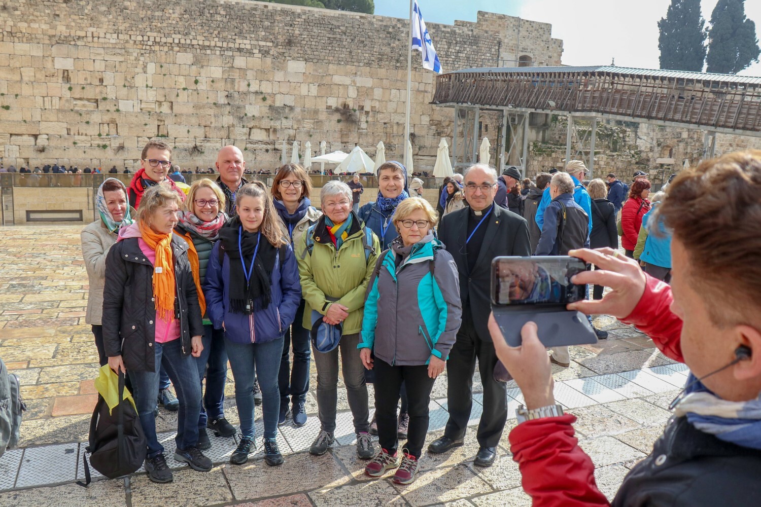 Sr. Maria mit der Dobler Gruppe und Bischof Wilhelm Krautwaschl vor der Klagemauer in Jerusalem. Ihre erste Reise nach Israel.