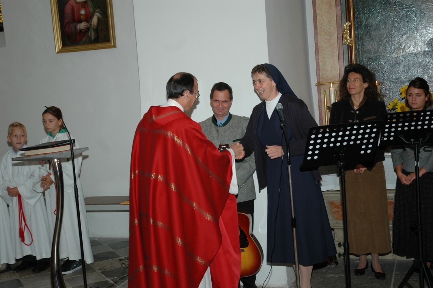 Pfarrer Johann Karner überreicht Sr. Maria das Dekret zur Wort-Gottes-Feier-Leiterin. Sie trägt erstmals eine weiße Albe.