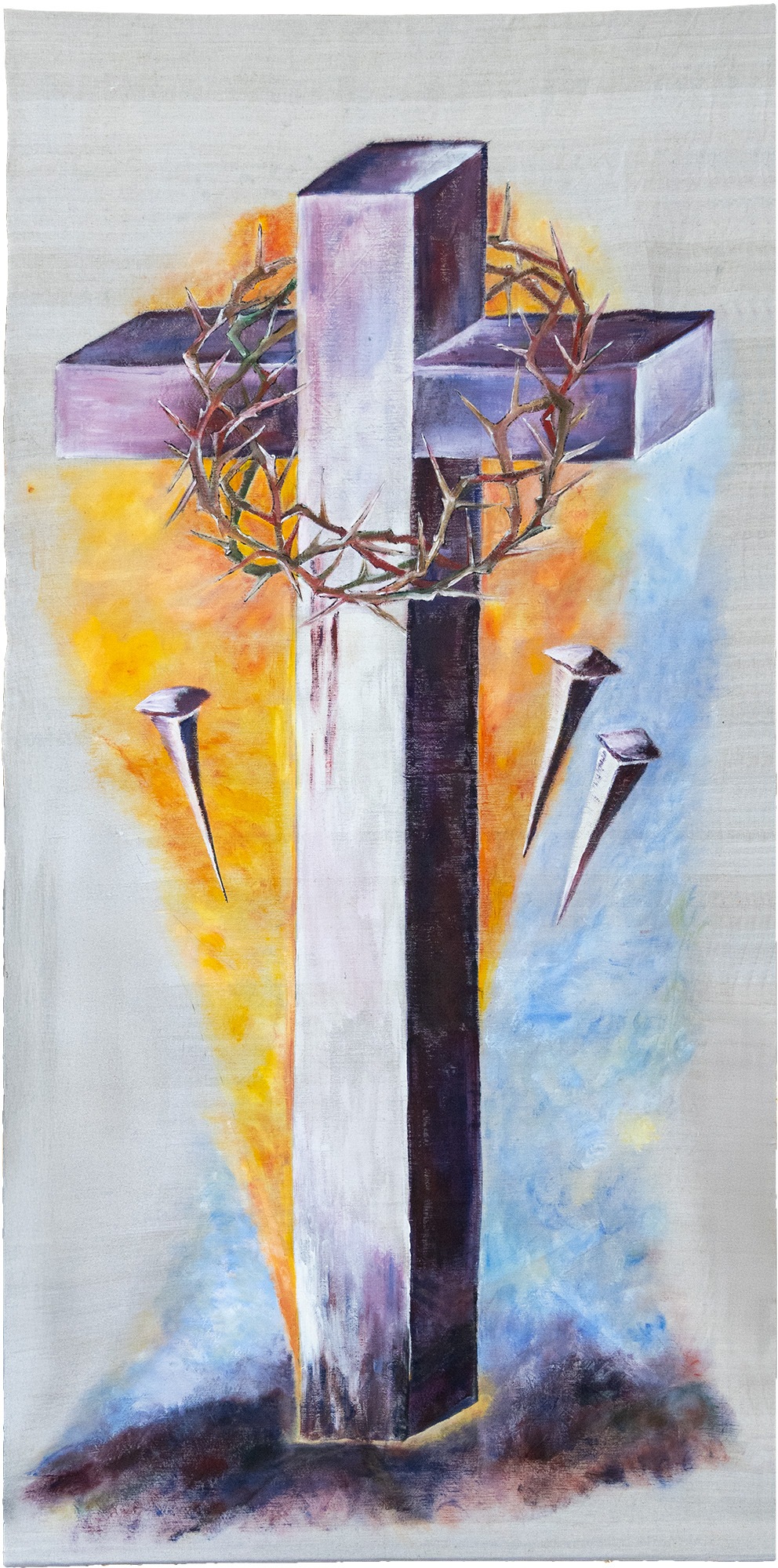 Vor vielen Jahren habe ich ein altes, handgewebtes Bauernleinen bekommen. Für mich ist das etwas Wertvolles. Ich habe schon länger den Gedanken, ein Fastentuch zu gestalten. In meinem Kopf hatte ich ein bestimmtes Bild. Leid, Schmerz, Tod und Auferstehung. Vor allem die Dornenkrone ist für mich ein starkes Symbol. Sie begleitet uns auch im Leben, wir müssen oft einen dornigen Weg gehen. Ich habe versucht, das Bild im Kopf auf das Leinen zu bringen. Vielleicht kann auch der Betrachter in meiner Darstellung seine Gedanken finden.