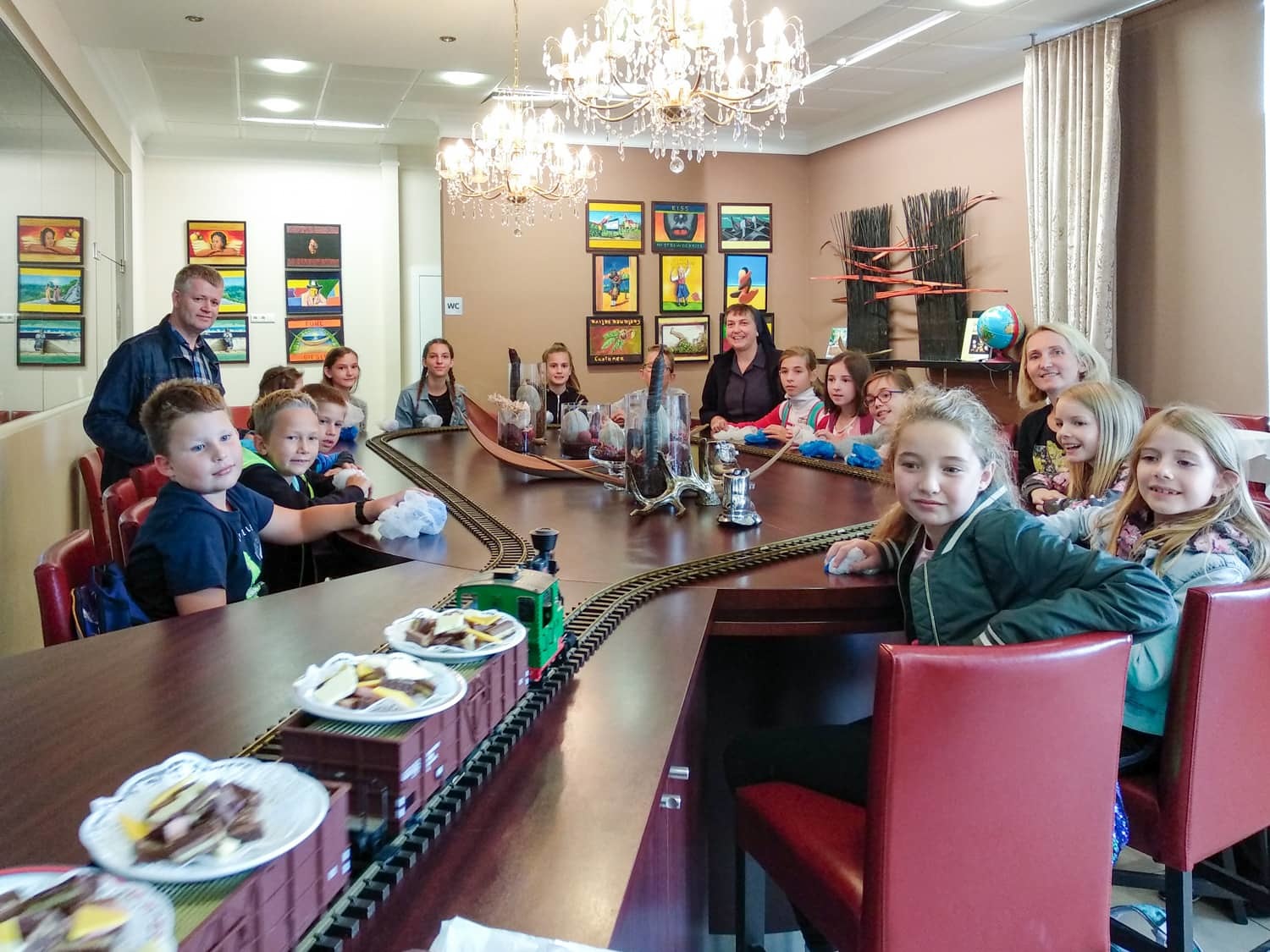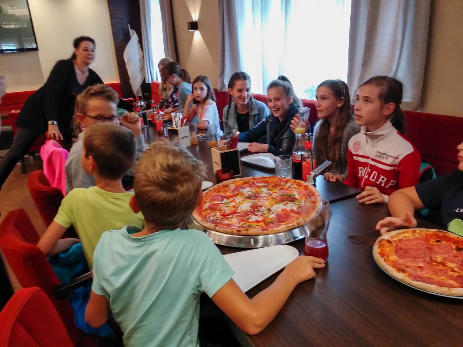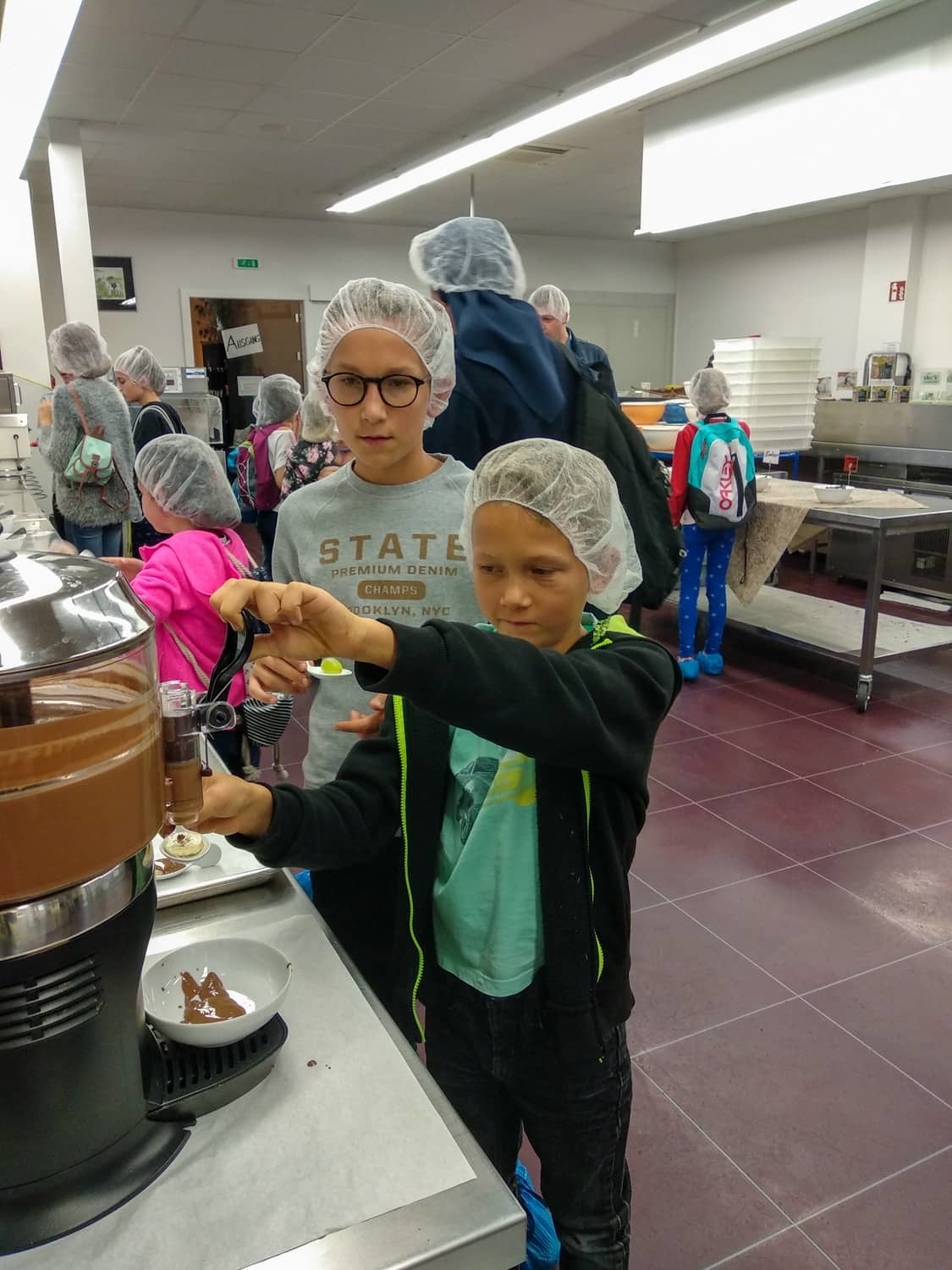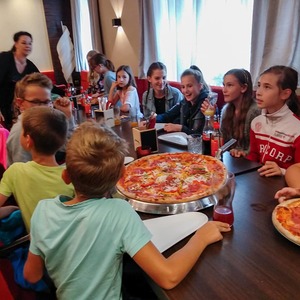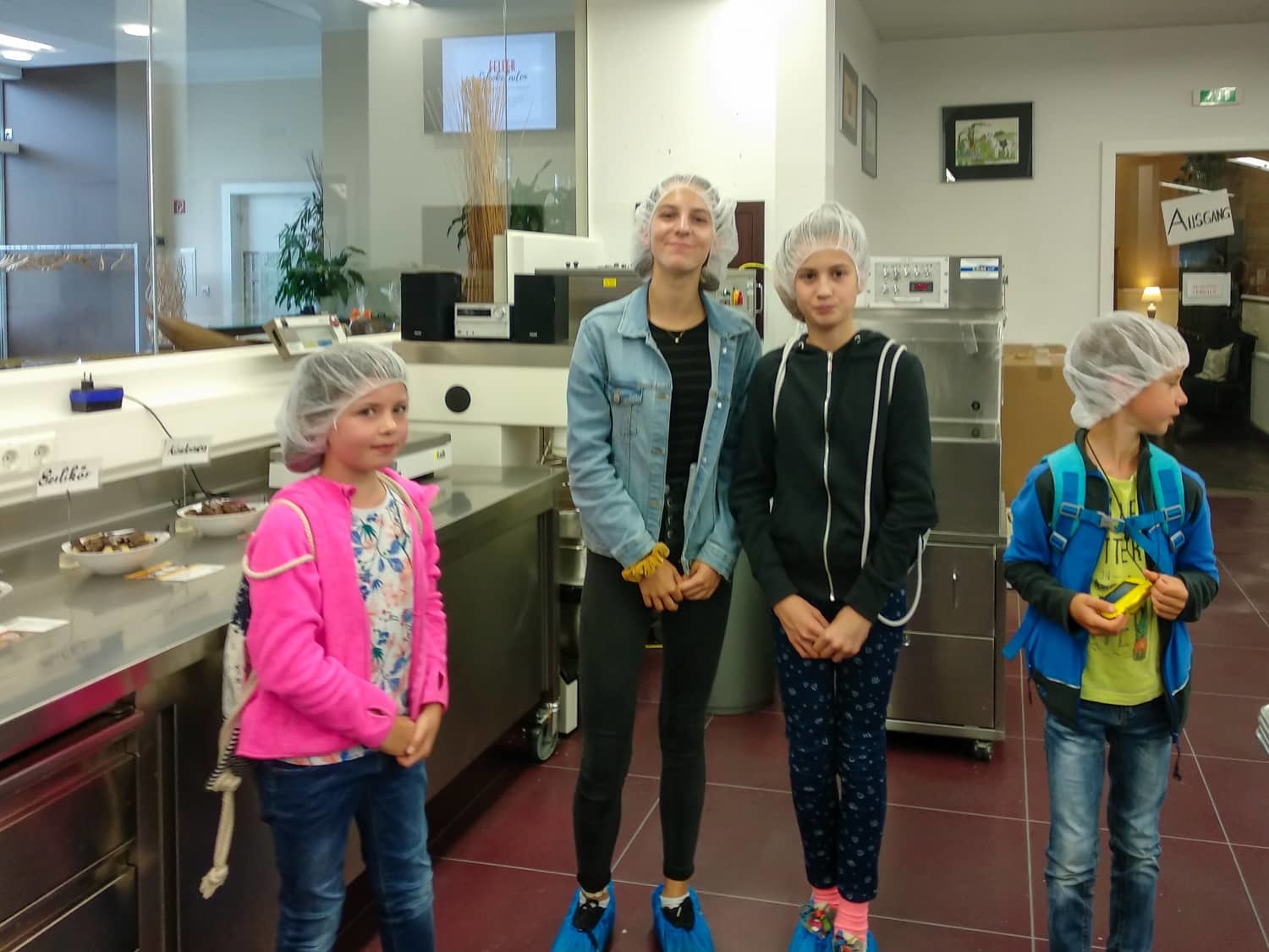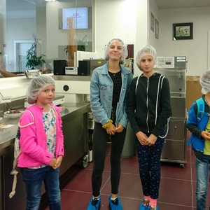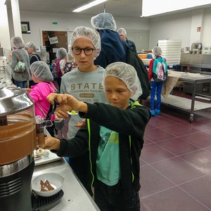 Danach gingen wir weiter Pizza essen. Zu fünft bestellten wir uns die größte Pizza, die ich je gesehen hatte. Als wir die Riesenpizza vernichtet hatten, ging es weiter zur Schokoladenmanufaktur Felber. Dort lernten wir über Kakaobohnen und wie aufwendig es ist eine Tafel Schokolade herzustellen. Natürlich naschten wir auch von einem Minizug, der uns Schokolade brachte. Nachdem wir alle einen Schokoladenvorrat für das nächste Monat gekauft hatten, machten wir uns wieder auf den Heimweg. Es war ein sehr schöner Tag.