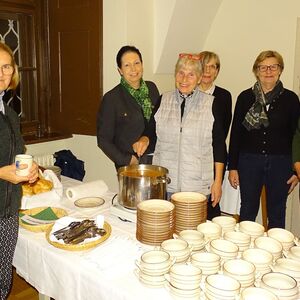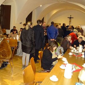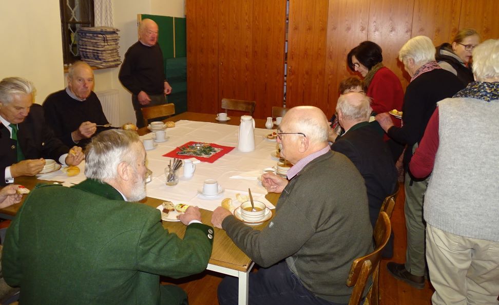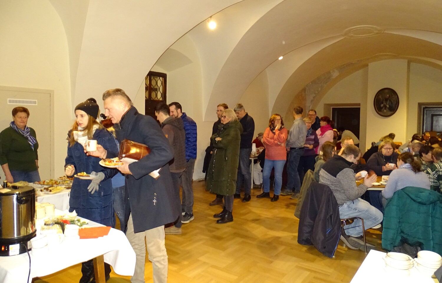Wohl auch deswegen blieben so viele Besucher der Rorate anschließend zum Pfarr-Kaffee und füllten den Saal und auch noch den Frauen-Raum bis auf den letzten Platz!