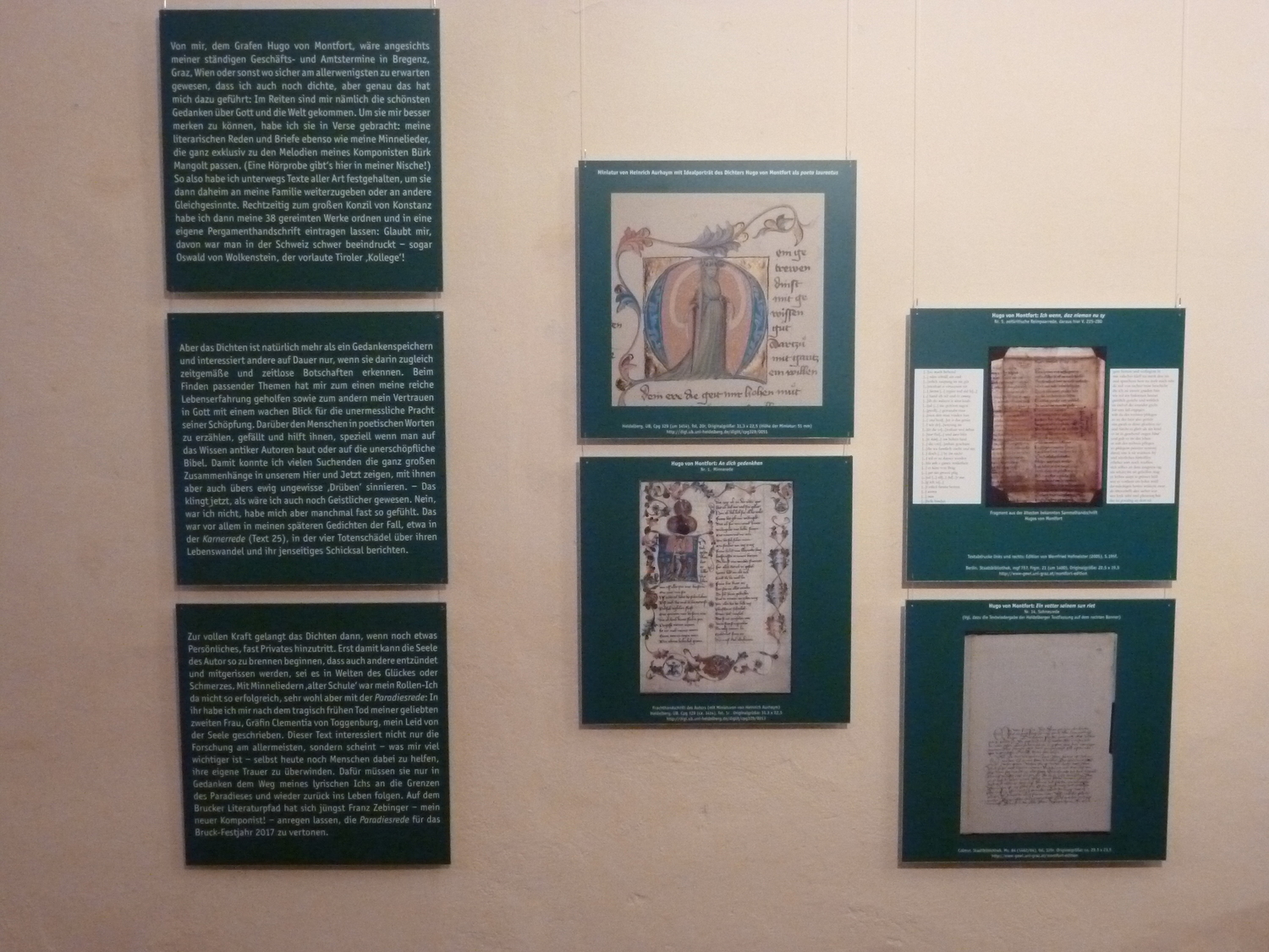 Graf Hugo von Montfort (1357–1423) war zugleich ‘Politiker’ und ein bemer­kenswerter Sprachkünstler des Spätmittelalters. Mehr als 170 erhaltene Dokumente bezeugen sein anstrengendes, aber wohl auch erfülltes und letztlich sehr geglücktes Leben: Aus dem bekannten Bregenzer Hoch­adelsgeschlecht stammend, führte ihn sein Weg schon 1373 (nach der Heirat mit der steiri­schen Adeligen Margarethe von Pfannberg, gest. um 1388/89) in die Steiermark. Auf dem Rücken seiner Pferde durchquerte er ferner weite Teile deutschsprachiger und einiger an­grenzender Länder, um im Dienste der Habs­burger diploma­tisch, aber auch bei kriegerischen Feldzügen mitzuwirken oder um seinen eigenen ansehnli­chen Besitz in den Wirren der Zeit zu sichern und zu mehren. In eine tiefe Sinnkrise stürzte der Montforter anscheinend, als seine zweite Frau, Clementia von Toggenburg, in noch sehr jungen Jahren starb. Um ihren Tod zu überwinden, hat er die sog. Paradiesrede ge­dichtet: In diesem seinem umfangreichsten Verstext schildert er, wie der gleichnamige Ich-Erzähler versucht, seiner verstorbenen Frau, genannt ‚Gräfin Ment‘, ins Jenseits nachzufolgen. Er wird jedoch von einem strengen Torwächter daran gehindert, sein Leben durch einen zu frühen, zumal für sündenbeladene Menschen riskanten Eintrittsversuch ins Paradies zu been­den. Stattdessen stärken der Wächter und eine überirdische Gralsbotin den Lebensmut des trauernden Witwers.