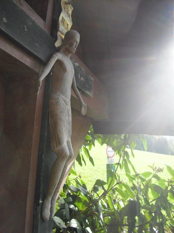 Der aus Holz geschnitzte Leib des Gekreuzigten auf dem kleinen schwarzen Holzkreuz weist einige Besonderheiten auf, herabhängende Hände, fehlende Wundmale und Nägel, und ist mit der Inschrift INRI (Jesus von Nazareth, König der Juden) versehen.