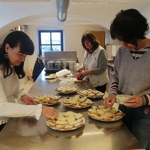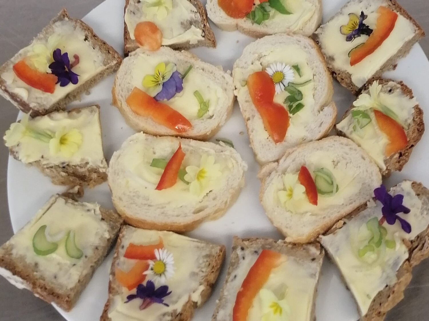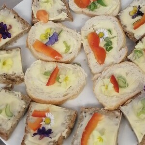 Viele schöne Gespräche und Begegnungen folgten bei guter Verpflegung. Besonders appetitlich waren die Butterbrote aus selbst gebackenem Schwarzbrot - bunt verziert mit den ersten Blüten aus Gerti´s Garten. Auch ein Glaserl Wein durfte nicht fehlen und so fand der Nachmittag einen gemütlichen Ausklang.