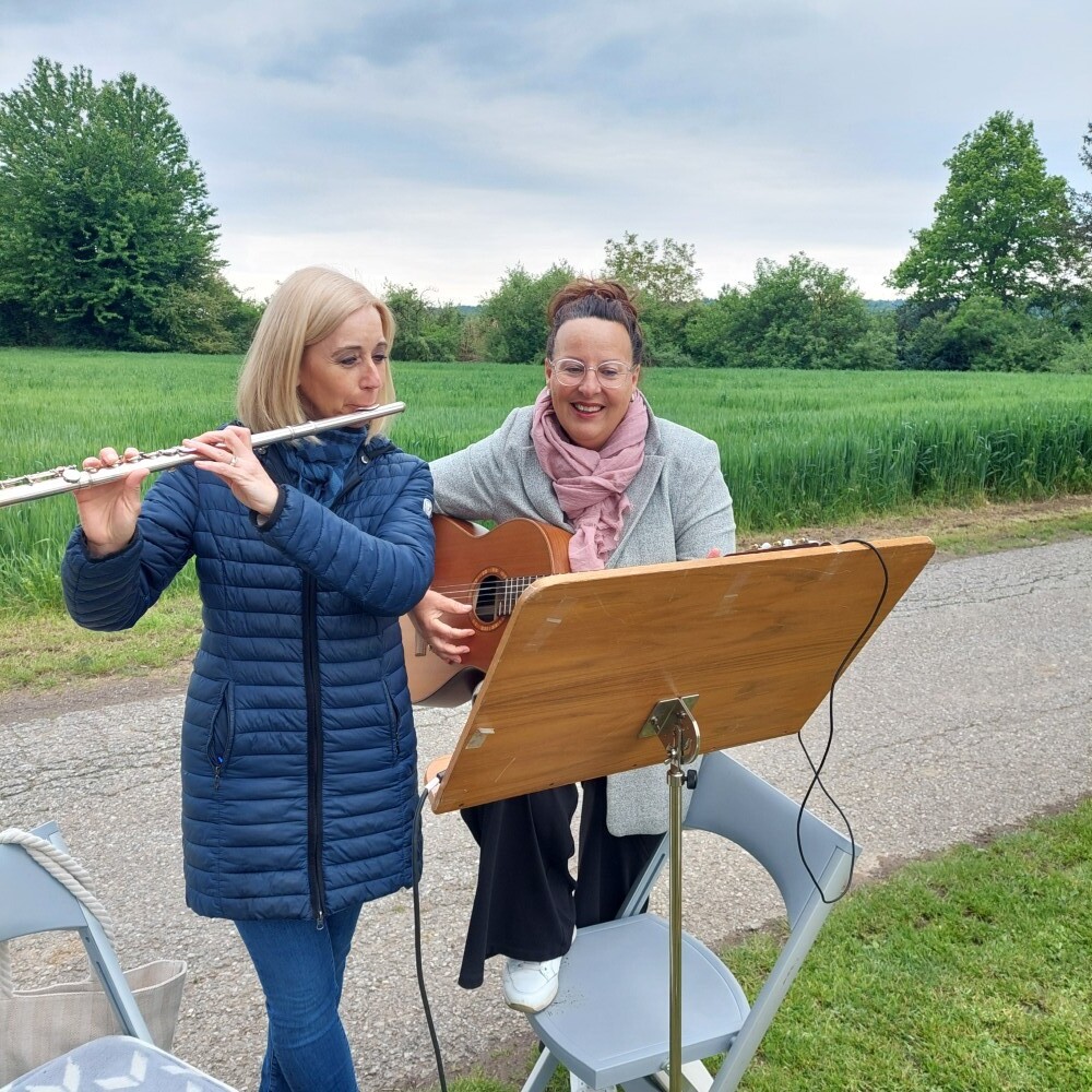 Ich lud die Mitfeiernden ein, im Stehen sich vorzustellen, verbunden mit der Erde zu sein, mit den Händen sich zum Himmel öffnen, im Gleichgewicht zu bleiben und die Kraft meiner Herzmitte zu spüren.
