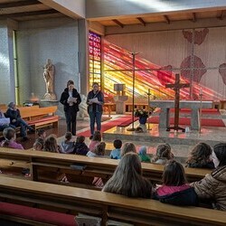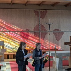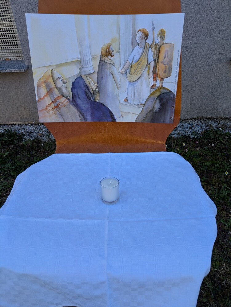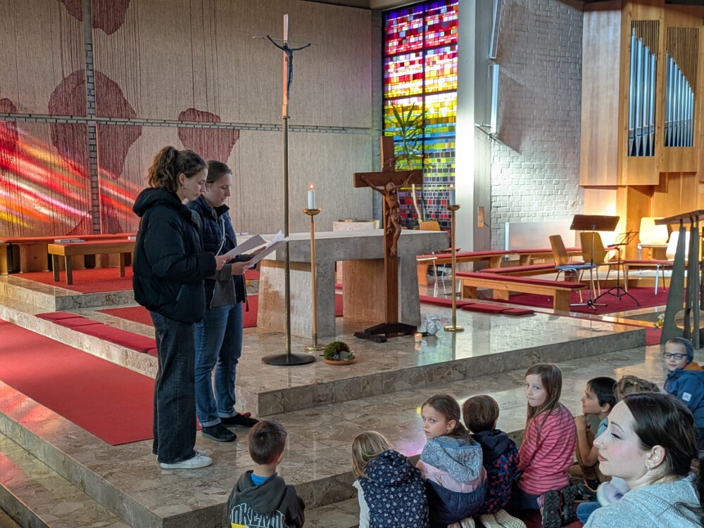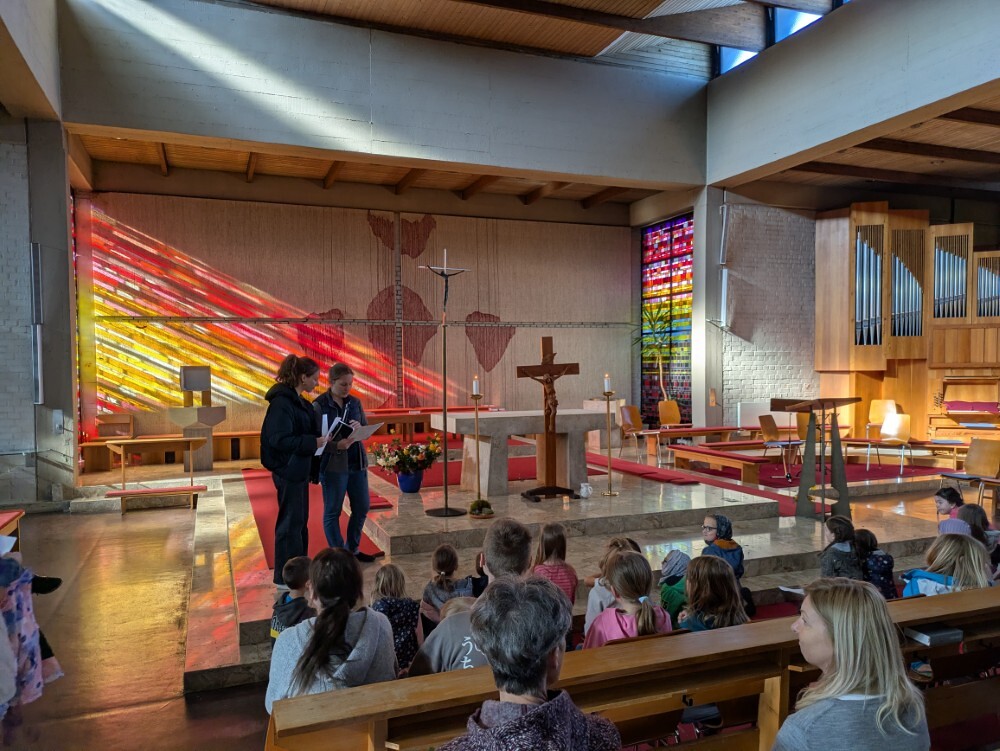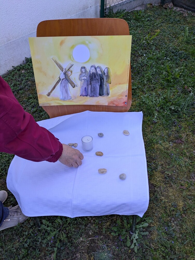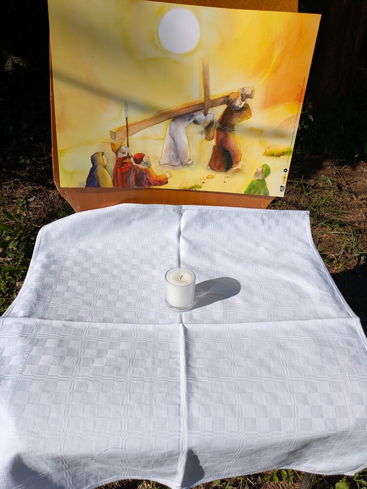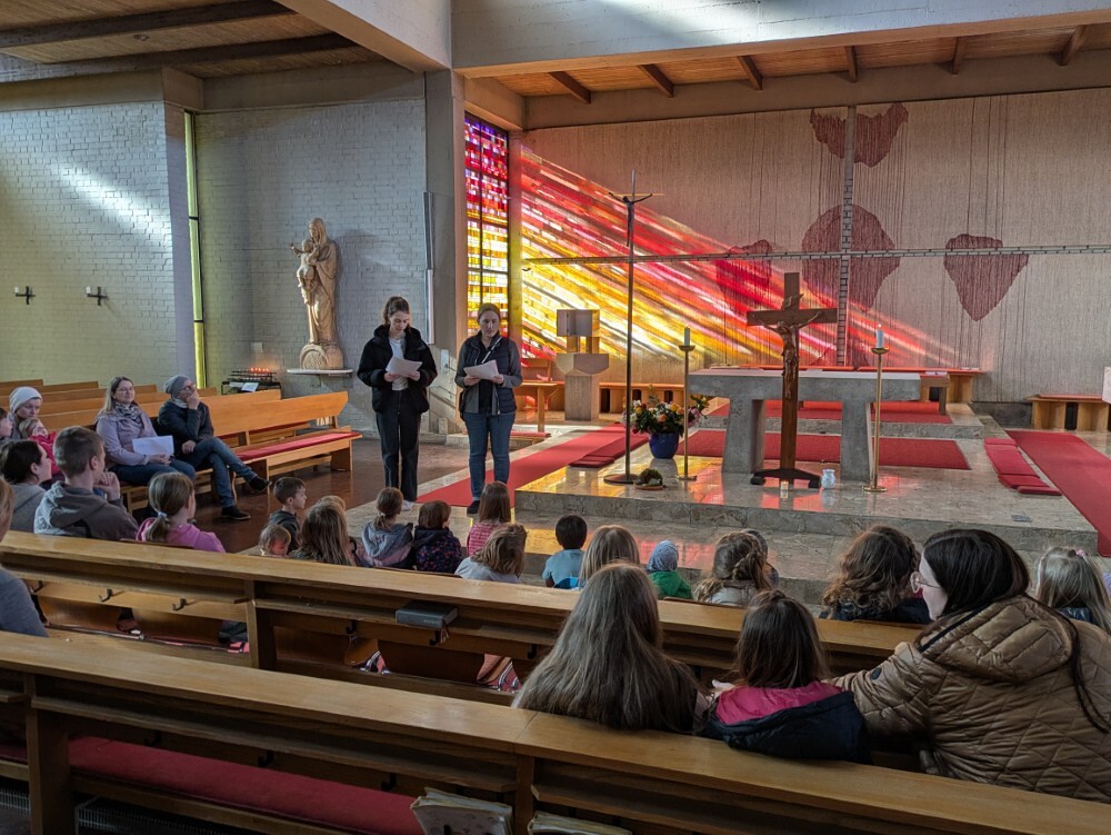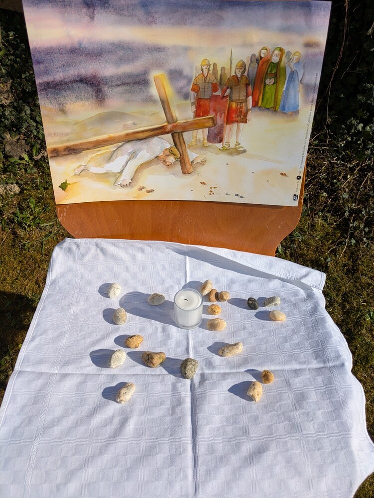 Beim Kinderkreuzweg wurde zirka 30 Kindern die Leidensgeschichte Jesu mit Symbolen und Bildern rund um Kirche und Pfarrheim von Monika Rainer und Julia Herk-Pickel kindgemäß nahegebracht.