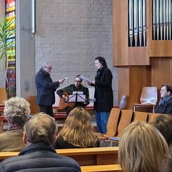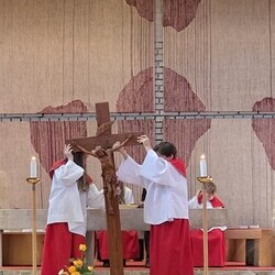 Der Karfreitag wurde in Stille vor dem leergeräumten Altar mit den Zeichenhandlungen der Kreuzverehrung, den großen Fürbitten und der Grablegung begangen. Gestaltet wurde die liturgische Feier von Thomas Possert und einem Ensemble rund um Siegfried Kager.