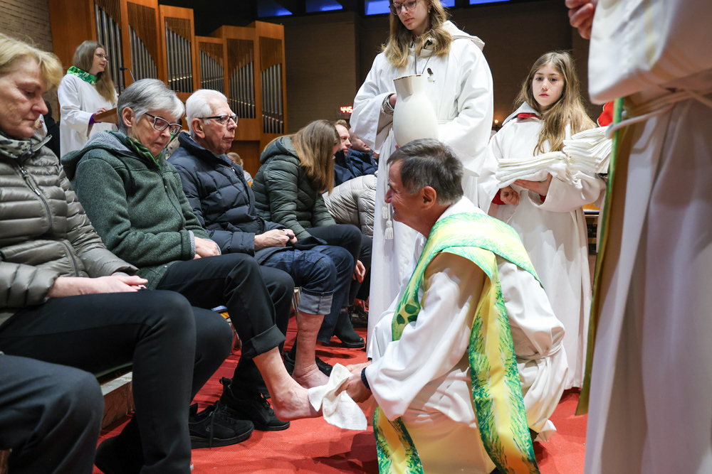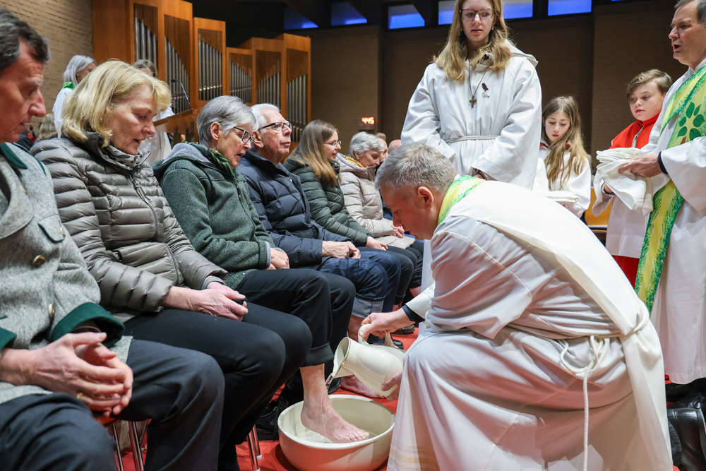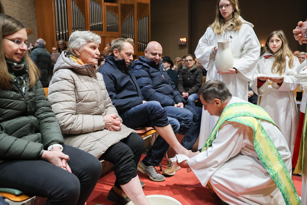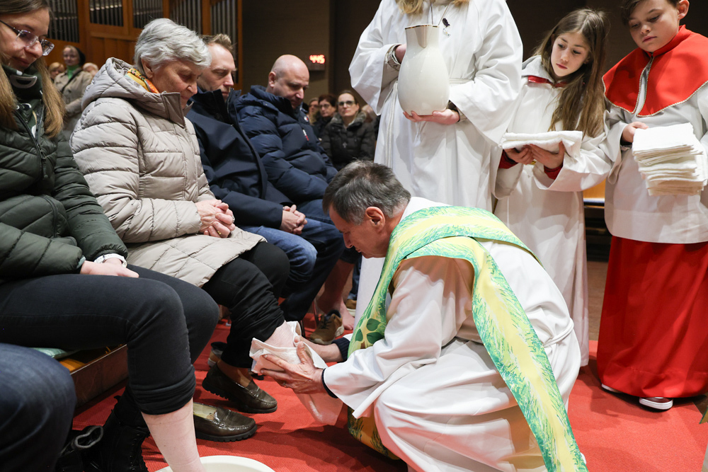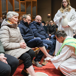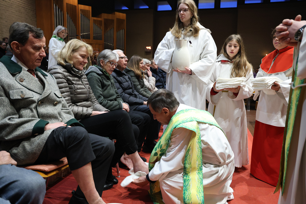 Bei diesem Mahl nahm Jesus das Brot, brach es, reichte es seinen Jüngerinnen und Jüngern und sagte: „Das ist mein Leib, der für euch hingegeben wird.“ Doch Jesus ging noch einen Schritt weiter: Er wusch die Füße seiner Freunde – nicht als Zeichen von Macht, sondern von Liebe und Dienstbereitschaft. Deshalb wurden stellvertretend zwei Personen jeder Pfarre von Pfarrer Claudiu Budău und Diakon Franz Habith die Füße gewaschen.