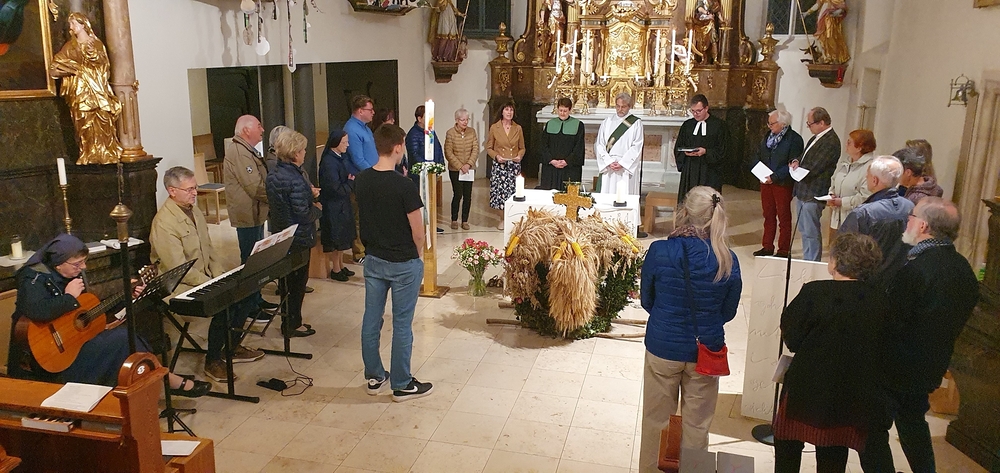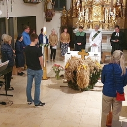 Von der schwungvollen Musik unserer Musikgruppe begeistert, sangen wirklich alle gerne mit, vom Kirchenchor bis zu den VS-Kindern, deren besonderer Erntedankschmuck übrigens nun die Empore im Altarraum ziert.