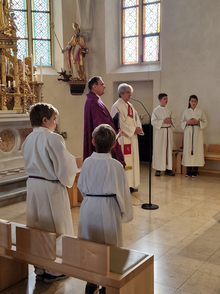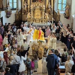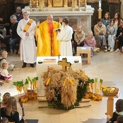 Voll Dankbarkeit und Freude feierten wir das diesjährige Erntedankfest in unserer mit großen und kleinen Leuten gut gefüllten Kirche. Vikar Norbert Glaser zelebrierte die heilige Messe, assistiert von Diakon Michi Zepf und sieben tüchtigen Minis.