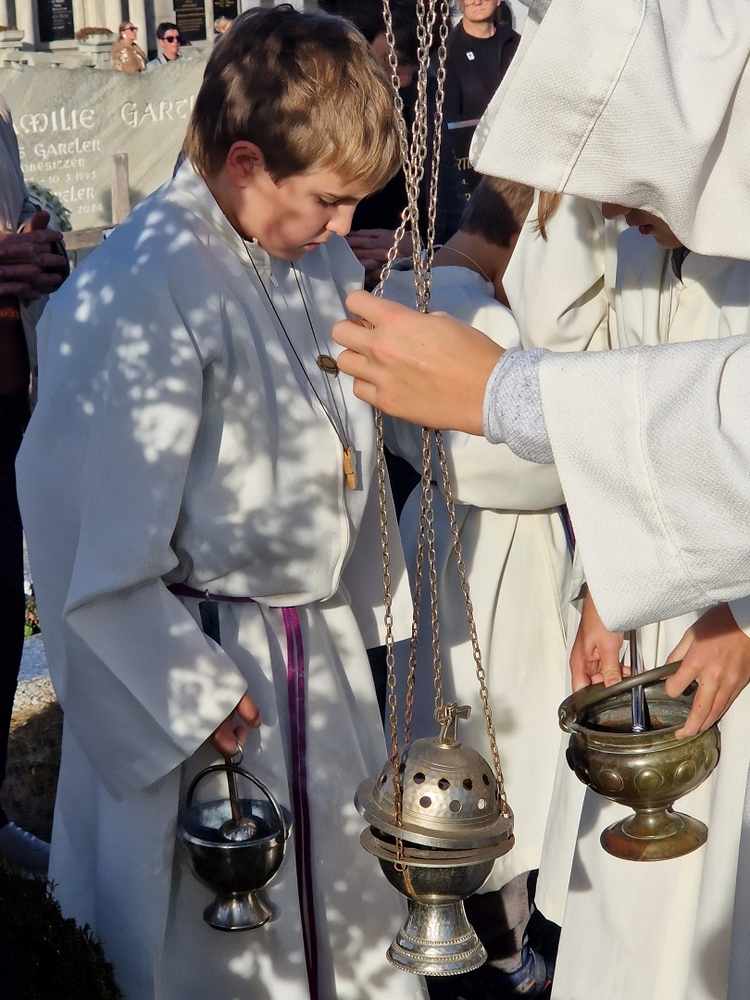Zuvor wurde in schönen Texten und Gebeten, musikalisch umrahmt von der Marktmusik Unterpremstätten-Zettling, aller Verstorbenen gedacht. Auch wurden die Namen der im vergangenen Jahr heimgegangenen Personen nochmals laut ausgesprochen. Der aufsteigende Weihrauch verleiht den Verstorbenen besondere Würde und möge unsere Gebete zu Gott emportragen.