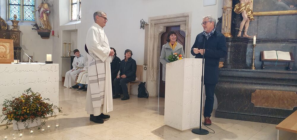 Vor dem Schlusssegen überreichte Ernst Pock im Namen der Pfarre dem neuen Diakon ein Aspergill, mit dem dieser gleich voll Freude die Gläubigen segnete. Für seine Ehefrau Eva, die ihm begleitend zur Seite steht, gab es einen Blumenstrauß, mit den besten Wünschen für sie.