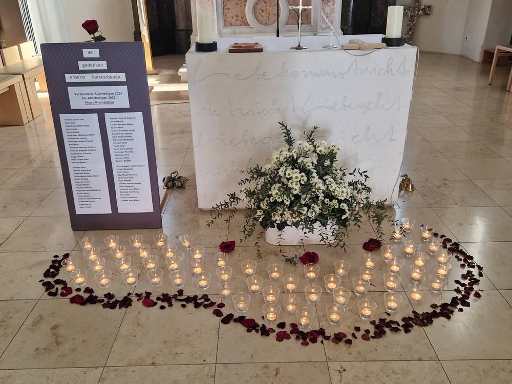 Vor dem Altar brannten 59 Teelichter für alle Menschen, die im letzten Jahr in unserer Pfarre verstorben sind. Ihre Namen wurden noch einmal laut ausgesprochen. Ein Teelicht leuchtete für alle Verstorbenen, die ungenannt blieben.