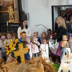 Mit dem „Erntedank-Tanz“ brachten die Kindergarten- und Kinderkrippenkinder buntes Leben in die Feier, auch das „Vater unser“ sowie das „Farbenlied“ lockten sie und alle anderen Kinder aus der Reserve.
