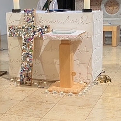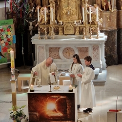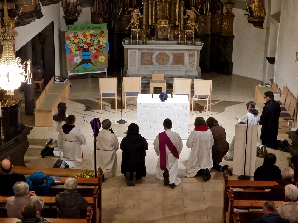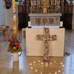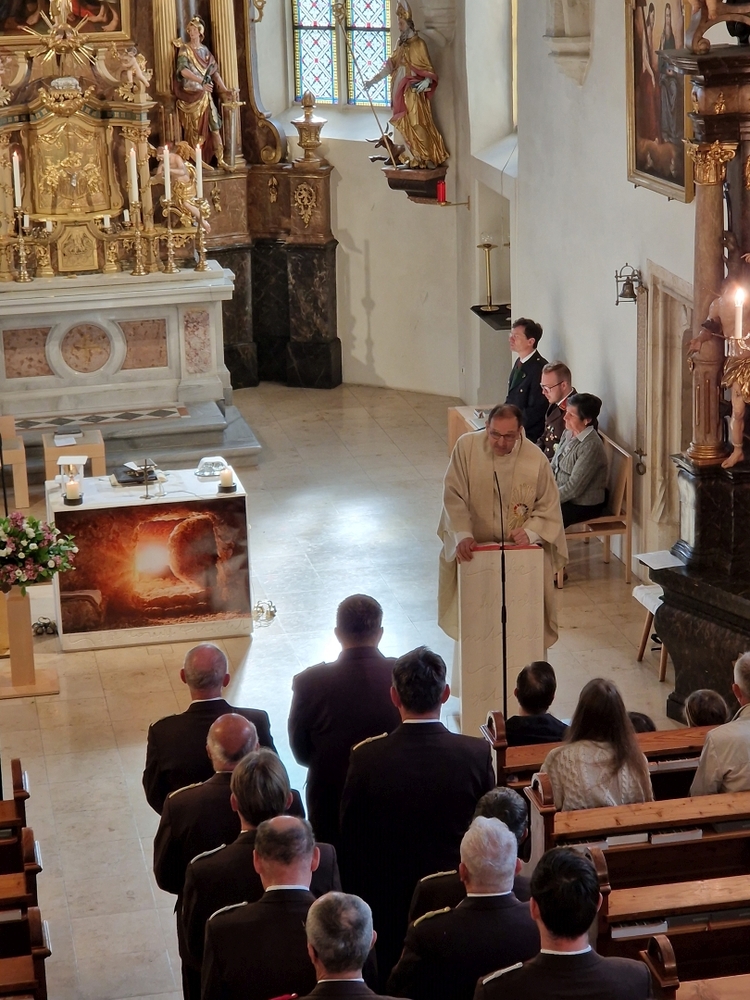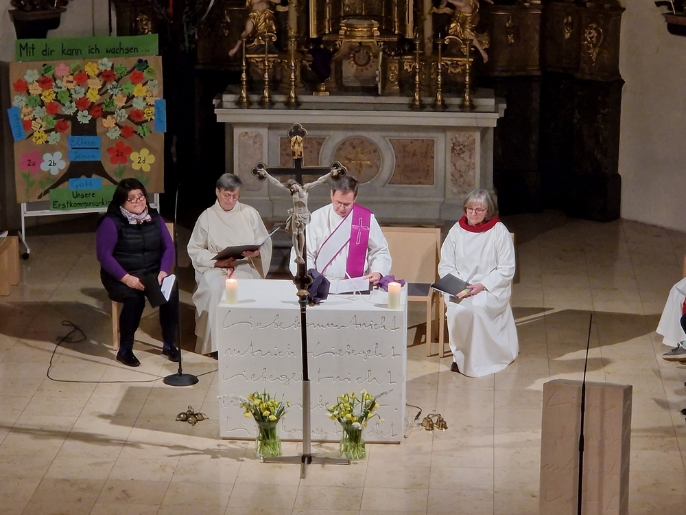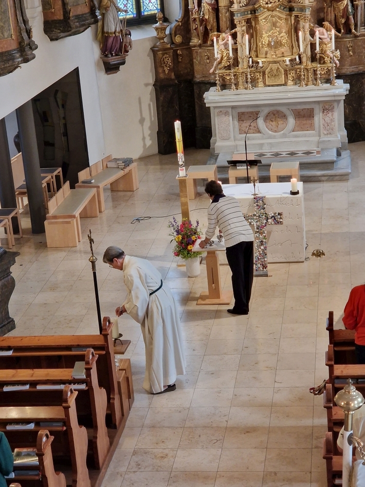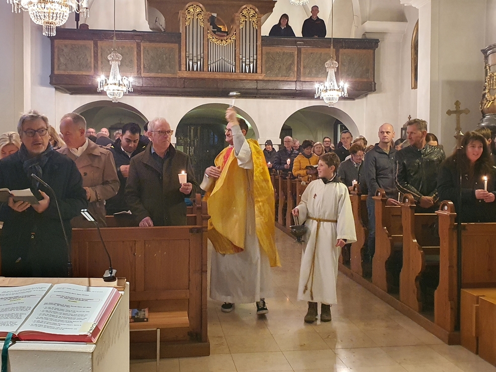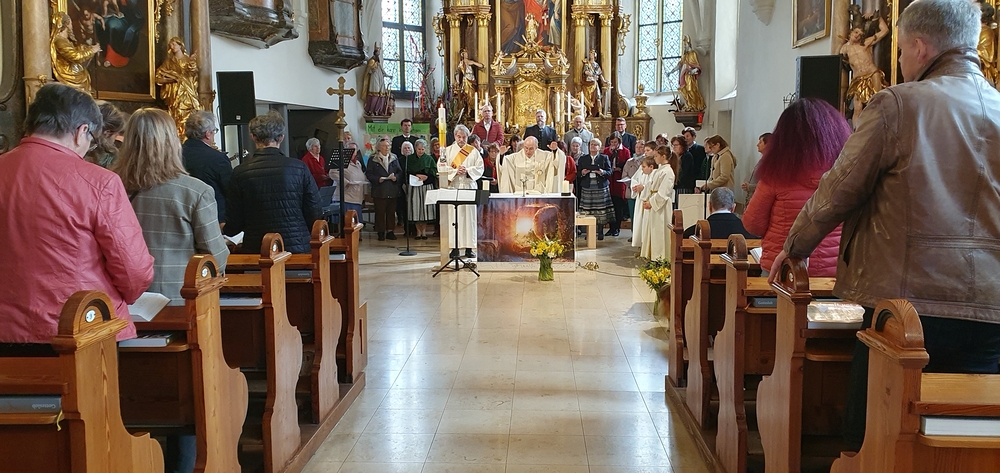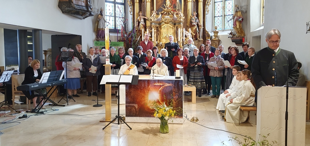 Die Auferstehungsfeier zelebrierten Vikar Gerhard Hatzmann und Diakon Michi Zepf, zusammen mit den Minis, den Lektorinnen und Lektoren, mit Kantor und Kantorin, der Musikgruppe und allen Gläubigen.