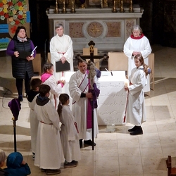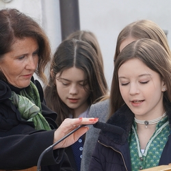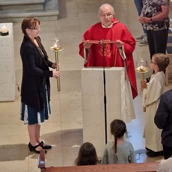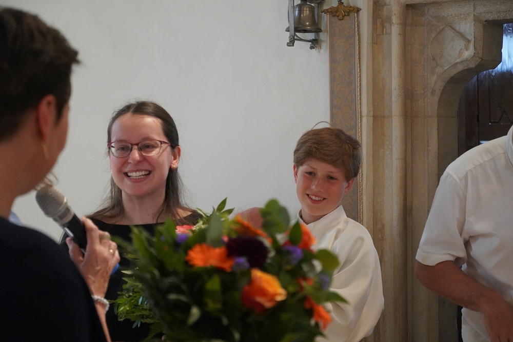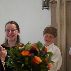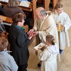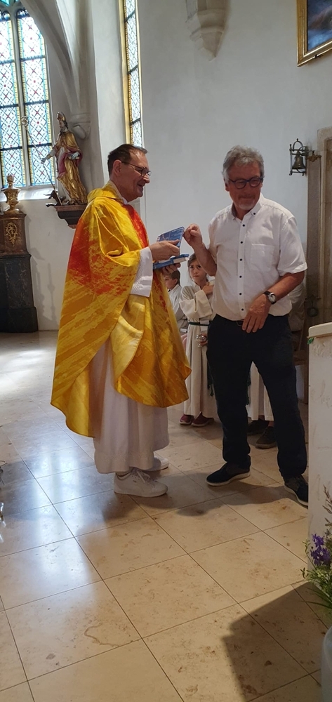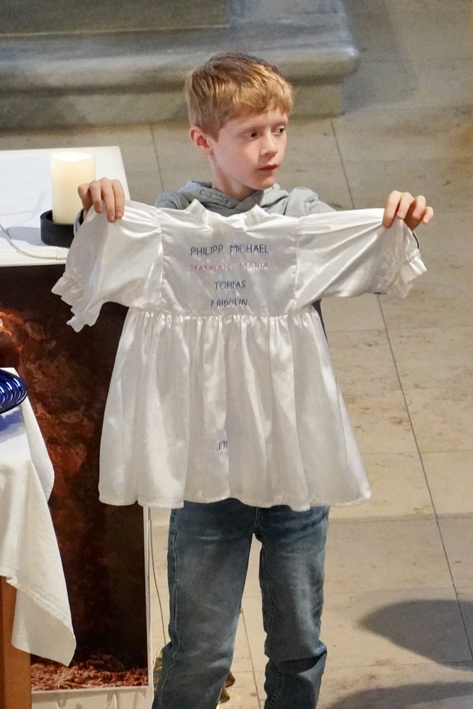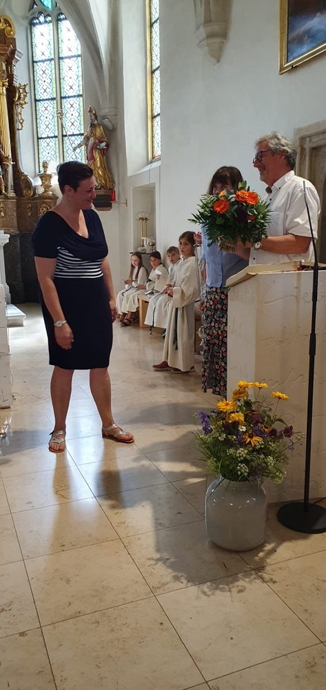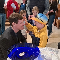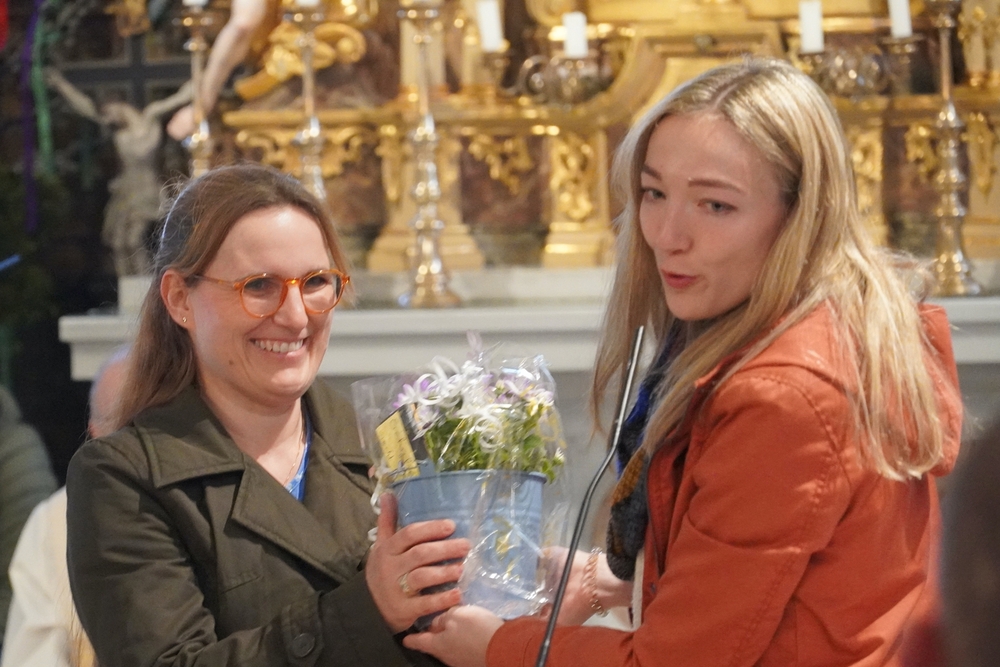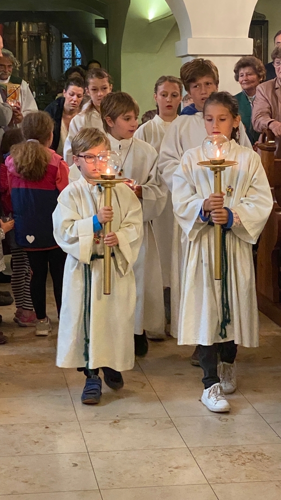 Zur besonderen Botschaft dieser heiligen Messe und zur besonderen musikalischen Gestaltung kam noch ein besonderes Danke-Sagen. Einige Minis bekamen für ihre treuen Mini-Dienste Auszeichnungen, die Anja Asel überreichte. Die drei neuen Minis, Miriam, Victor und Maximilian, erhielten als „Antrittsgeschenk“ das Mini-Maskottchen Fridolin, ein kuscheliges Schäfchen.