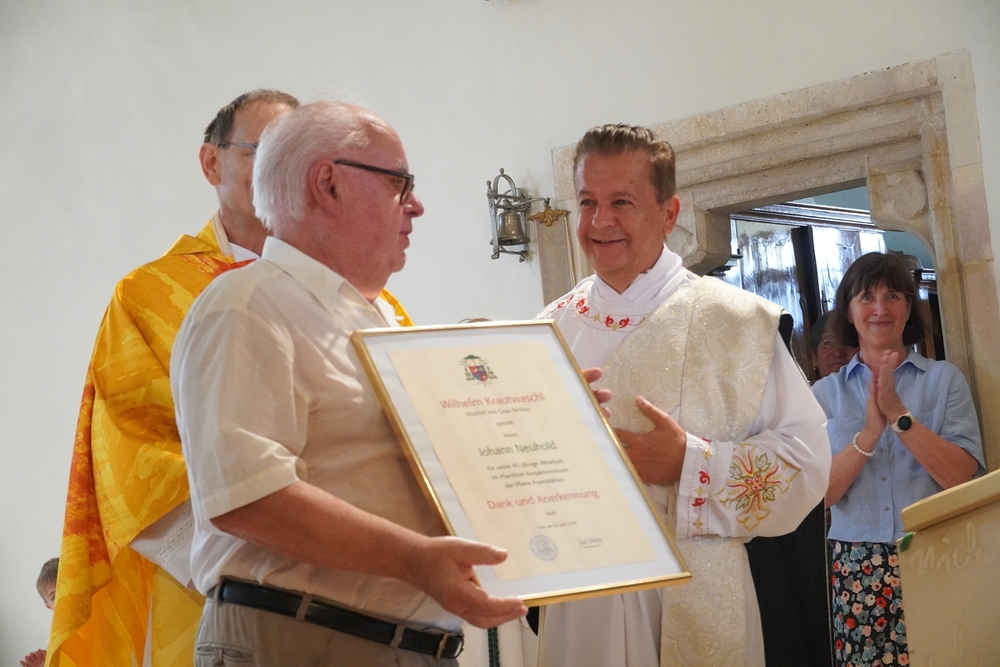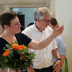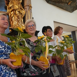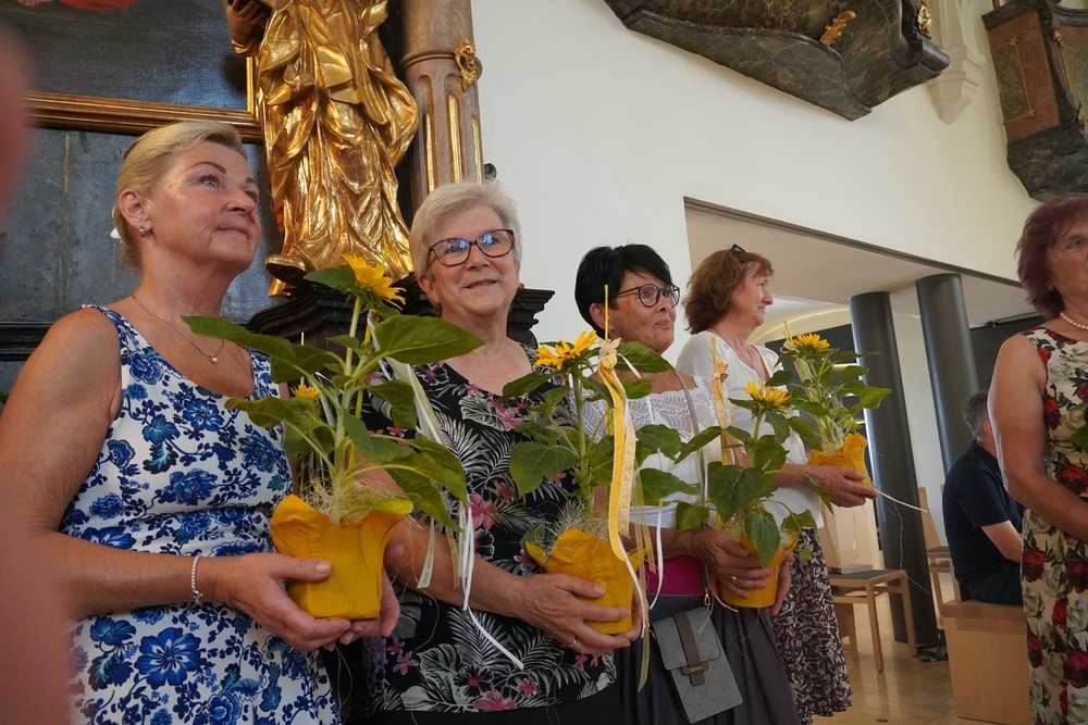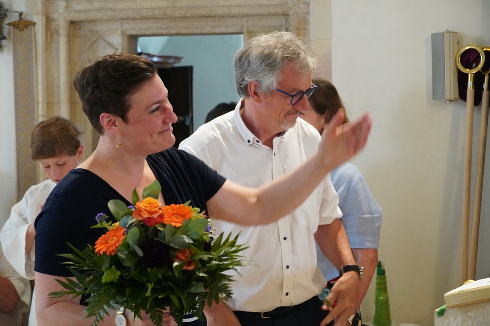 So wie die Sonne an diesem Sonntag strahlte, strahlten auch die Jubelpaare und sie waren berührt von den Texten und der Musik, der einfühlsamen Predigt von Vikar Gerhard Hatzmann, den Gebeten und Segensworten. Die Rose mit dem Segensröllchen wird sie noch länger an die herzliche Feier erinnern.