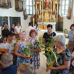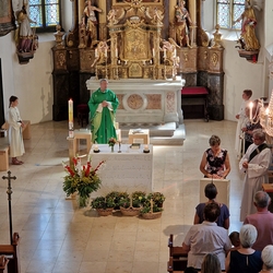 Am Sonntag darauf, dem 18. August, erfüllte feiner Kräuterbüschelduft den Altarraum unserer Kirche. Feierlich segnete Pfarrer Claudiu Budau am Ende der heiligen Messe alle Kräuter- und Blumensträußchen, auch spendete er zusätzlich den Wettersegen.