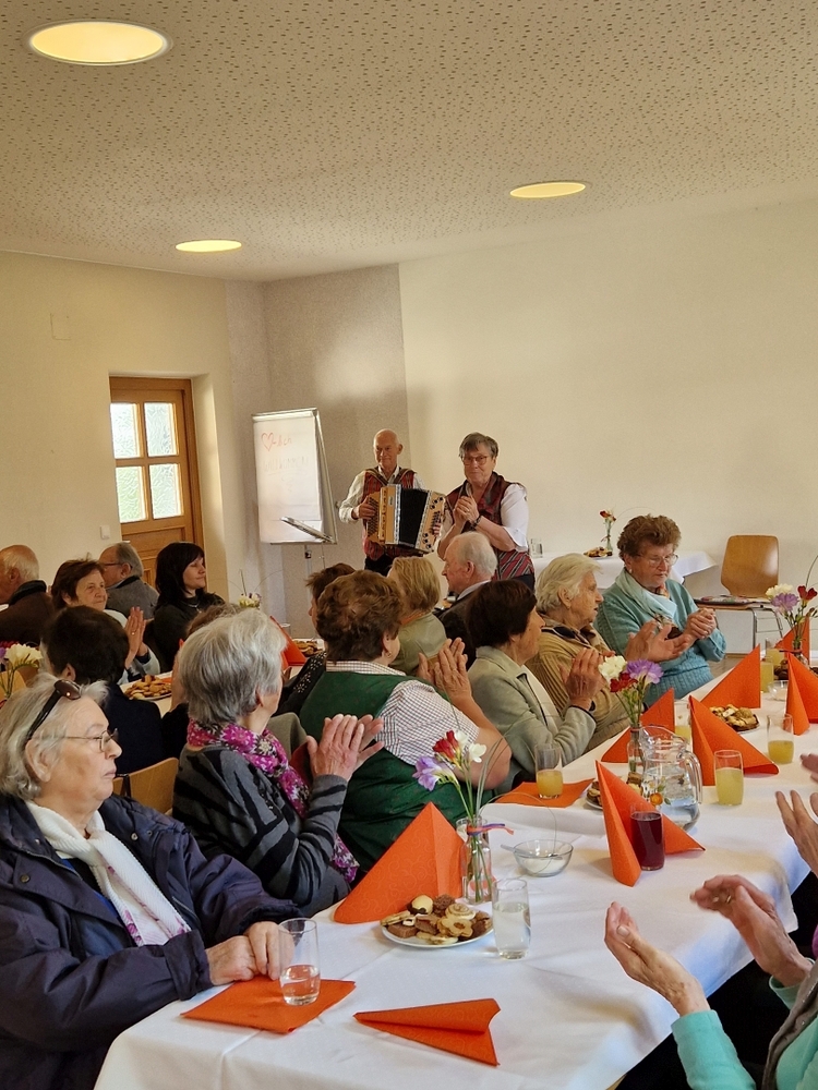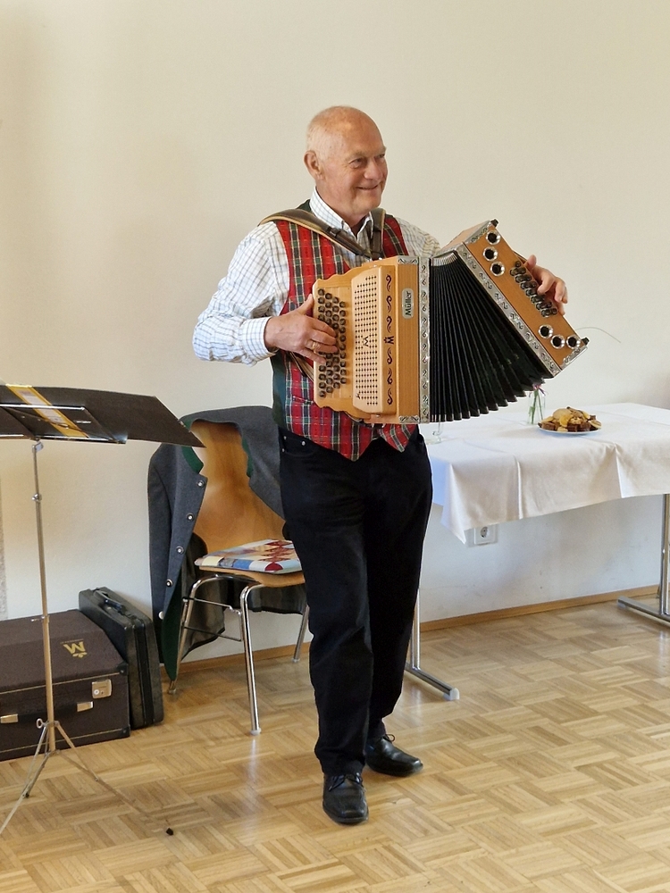In netter Gemeinschaft genossen die Seniorinnen und Senioren dann die Würstel-Jause sowie Kuchen und Kaffee. Dazu sorgte Anton Ruprecht auf der Ziehharmonika für angenehme musikalische Untermalung.