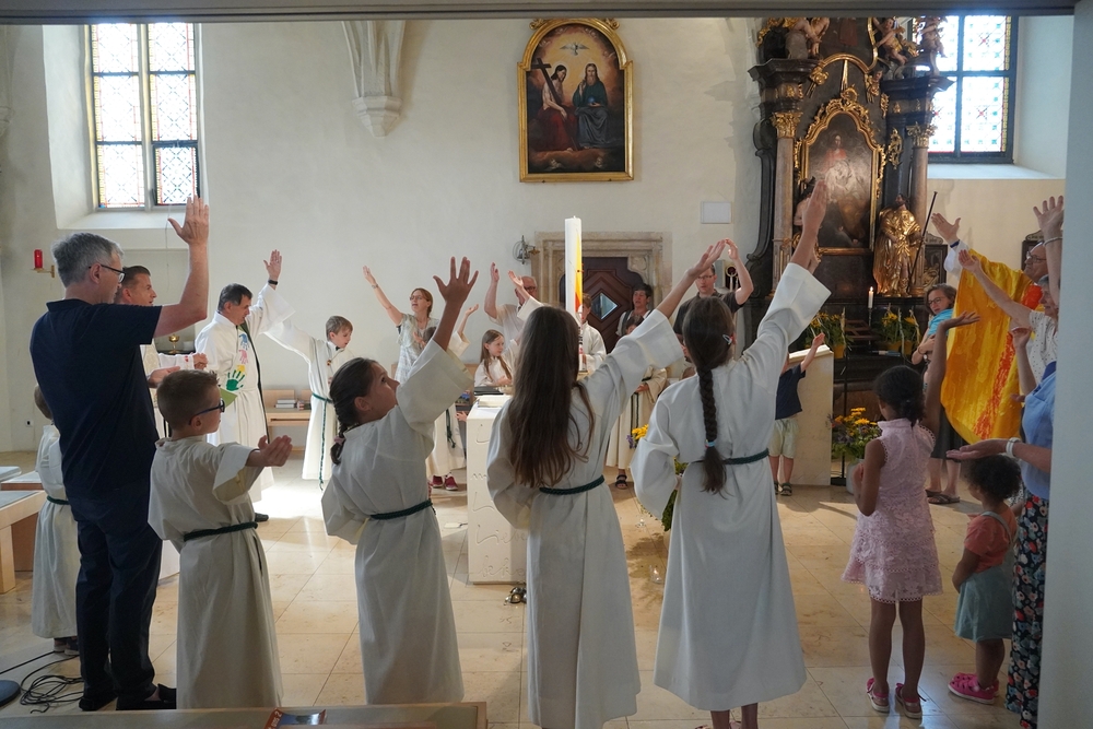 • in spielerischer Form die Antworten der hl. Messe kennen lernen und üben