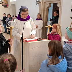 Erstmals durften in der Kirche auch die anwesenden Kinder die Adventkränze segnen, denn … „Segnen darf jede/r, dazu muss man nicht Priester oder Diakon sein!“ So lud Diakon Michi Zepf die Kinder dazu ein - und es machte ihnen sichtlich Freude!
