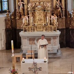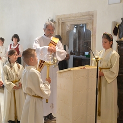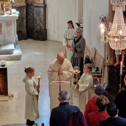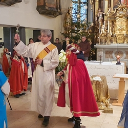 Nach altem Ritus segnete Diakon Michi Zepf nach dem Schlusssegen noch das „Dreikönigswasser“ und das Salz, welches in kleinen Fläschchen mitgenommen werden durfte. Die Allerheiligen-Litanei wurde von Johannes Chum vorgetragen.