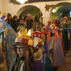 Eine Sternsingergruppe überbrachte die Botschaft, die schon Tage zuvor in den Häusern verkündet worden war: Gott braucht uns, braucht dich und mich, um der Gerechtigkeit auf Erden eine Chance zu geben. Er braucht unsere Solidarität mit den Ärmsten!