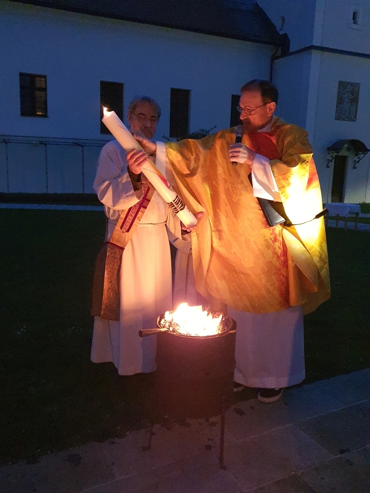 Nach altem Brauch segnete Diakon Michi Zepf am Karsamstag schon frühmorgens das Feuer vor der Kirche, das einige Kinder dann als „Weihfeuer“ in die Häuser und Wohnungen brachten. Es soll die Bewohner*innen vor Unwetter schützen.