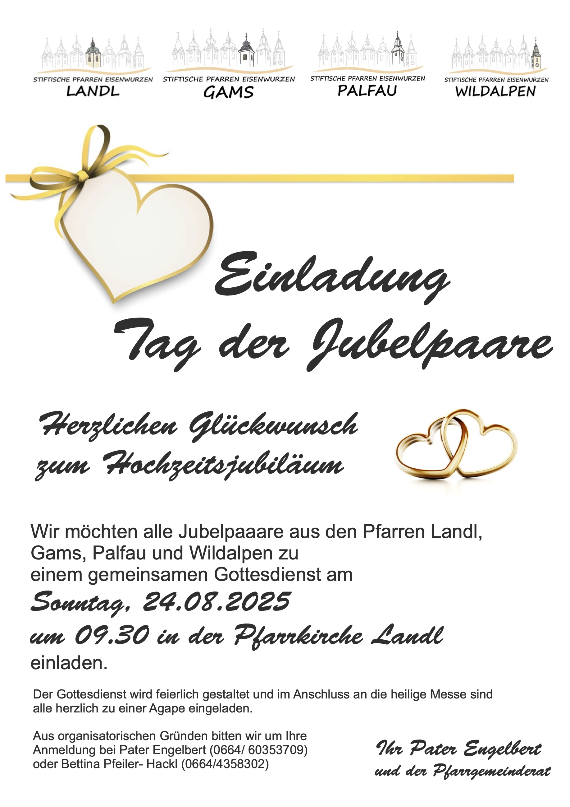 Wir möchten alle Jubelpaaare aus den Pfarren Landl, Gams, Palfau und Wildalpen zu einem gemeinsamen Gottesdienst am 24.08.2025 einladen.